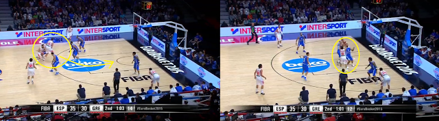 •           Buena defensa a los cortes por línea de fondo. Antetokounmpo y Printezis no pudieron realizar estos movimientos bastante habituales en su juego. España echó el cerrojo.